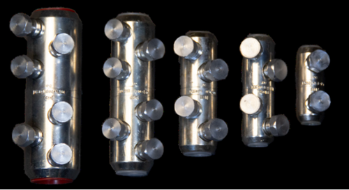 These are multi-range tin plated aluminum alloy straight connectors with a solid center barrier for both aluminum and copper conductors. These connectors are for use in low and medium voltage applications from #6 AWG up to 1500 Kcmil.