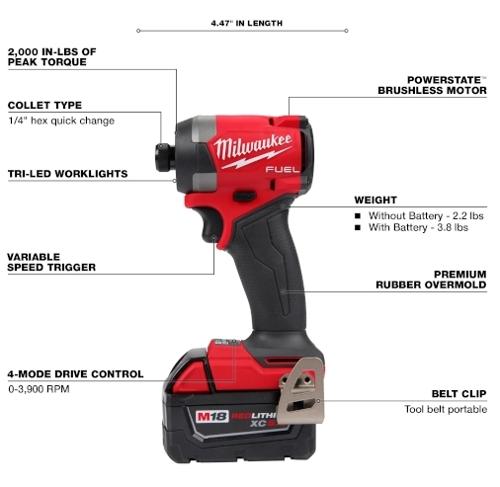 The MILWAUKEE M18 FUEL 1/4-inch Hex Impact Driver Kit is engineered for professionals who need maximum fastening power and speed in a compact design. Delivering 2,000 in-lbs of torque this tool provides exceptional performance for demanding applications such as deck building, cabinetry, and heavy-duty fastening. Its compact size of 4.47 inches allows easy access in tight spaces, while the POWERSTATE brushless motor ensures consistent power and durability under load. The 1/4-inch hex chuck enables quick bit changes for improved productivity on the job.